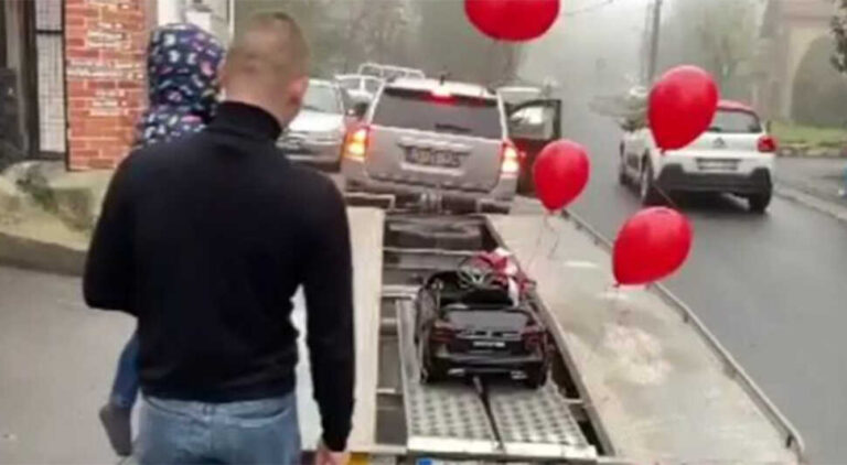 Na snimku koji se dijeli društvenim mrežema vidi se maleni, dječiji automobil kako ga dovozi veliki šlep, sa sve crvenim balonima koji se vijore!
