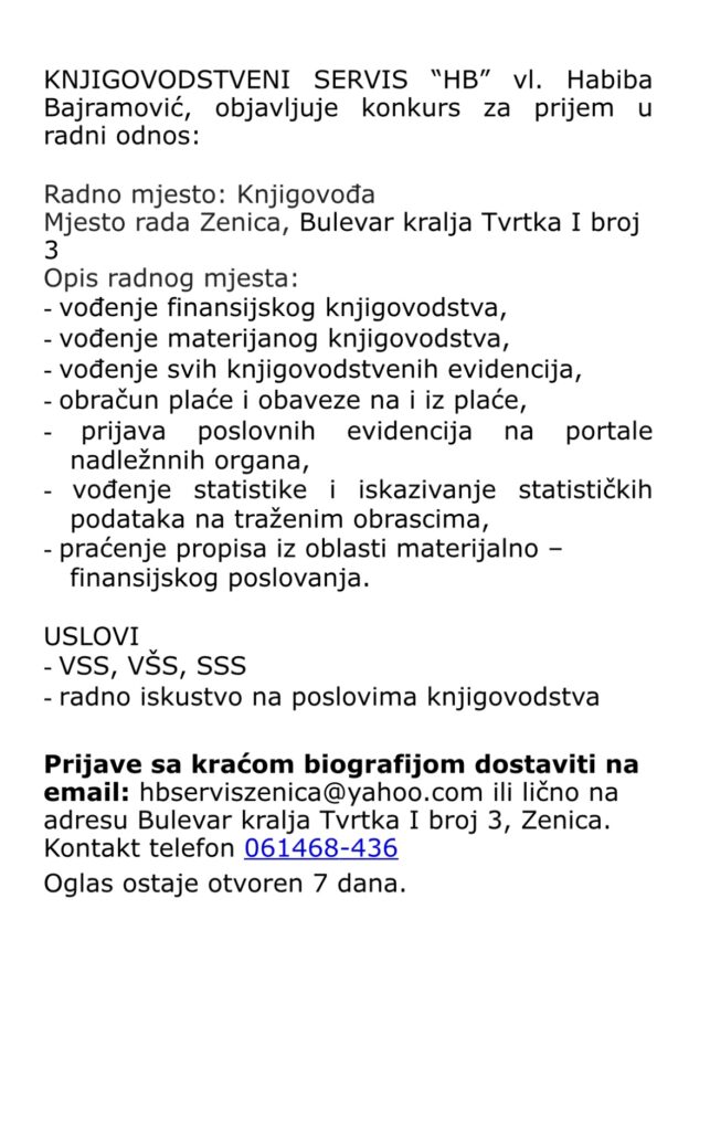 KNJIGOVODSTVENI SERVIS “HB” vl. Habiba Bajramović, objavljuje konkurs za prijem u radni odnos:
