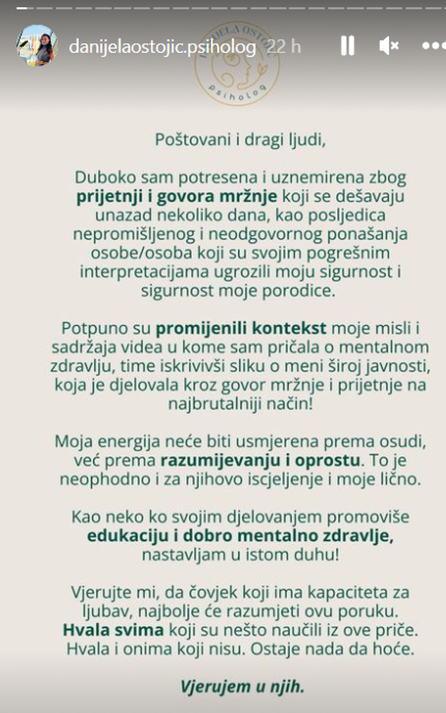 “Vjerujte mi, da čovjek koji ima kapaciteta za ljubav, najbolje će razumijeti ovu poruku. Hvala svima koji su naučili nešto iz ove priče. Hvala i onima koji nisu. Ostaje nada da hoće. Vjerujem u njih”, poručila je psihologinja.