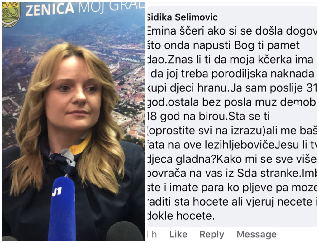 -Emina, šćeri, ako si se došla dogovarati što onda napusti Bog ti pamet dao. Znaš li ti da moja kćerka ima djecu i da joj treba porodiljska naknada da kupi djeci hranu. Ja sam poslije 31 godine ostala bez posla, muž demobilisani borac, 18 godina na birou. Šta se ti …… (oprostite svi na izrazu, ali me baš huja hvata na ove lezihljeboviče). Jesu li tvoja djeca gladna? Kako mi se sve više povraća na vas iz SDA stranke. Imbecili ste i imate para ko pljeve pa možete raditi šta hoćete, ali vjeruj nećete i dokle hoćete – napisala je Sidika Selimović.