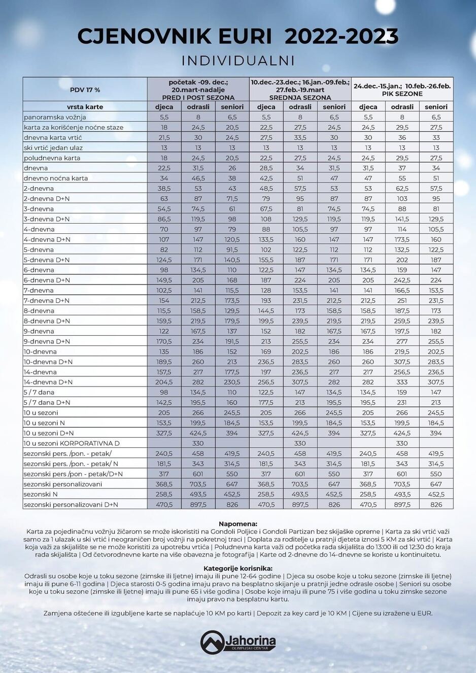 Ove godine cijene su naveli u eurima, a pretvorene u KM one iznose: 61,44 za pred sezonu, 66, 32 u srednjoj sezoni dok će u piku sezone odrasli morati izdvojiti 72,17 KM za dnevnu kartu.