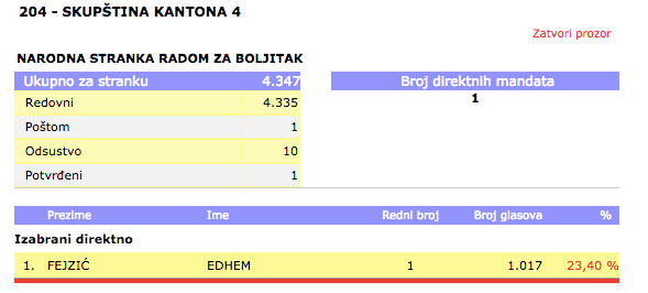 Iako je bio na rednom broju 12, za koji je u kampanji govorio da je to njegov životni broj, Fejzić će se oprostiti od udobne fotelje u Skupštini ZDK. Osvojio je svega 1.121 glas, odnosno 7,28 %, na osnovu 84,84 % obrađenih biračkih mjesta.