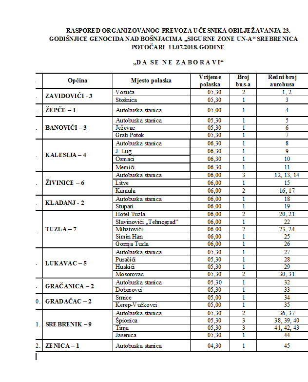 Autobus iz Zenice polazi u srijedu, 11. jula u pola pet ujutro sa Autobuske stanice u Zenici. Kretat će se putem Kladanj – Vlasenica – Milići – Zeleni Jadar – Srebrenica Potočari. Polazak iz Potočara je u 16:00.