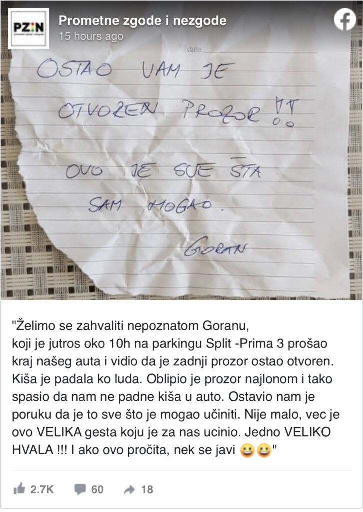 – Želimo se zahvaliti nepoznatom Goranu, koji je jutros oko 10 sati na parkingu Split – Prima 3 prošao kraj našeg auta i vidio da je zadnji prozor ostao otvoren. Kiša je padala k’o luda. Oblijepio je prozor najlonom i tako spasio da nam ne padne kiša u auto – napisali su vlasnici automobila.