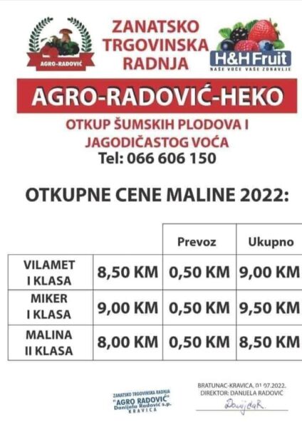Firma Agro-Radanović iz Bratunca izbacila je otkupnu cijenu maline za 2022 godinu: