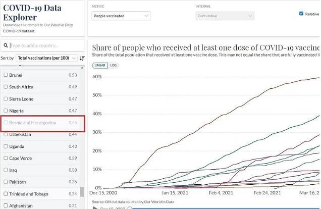 Mjesecima nakon što je u svijetu započela vakcinacija protiv koronavirusa, Bosna i Hercegovina je uvrštena na listu zemalja koje su primjenili barem prvu dozu vakcine. Nažalost, prema podacima koji su danas dostupni na ovoj stranici, naša zemlja nalazi se na samom dnu tabele koja pokazuje broj vakcinisanih na stotinu stanovnika.