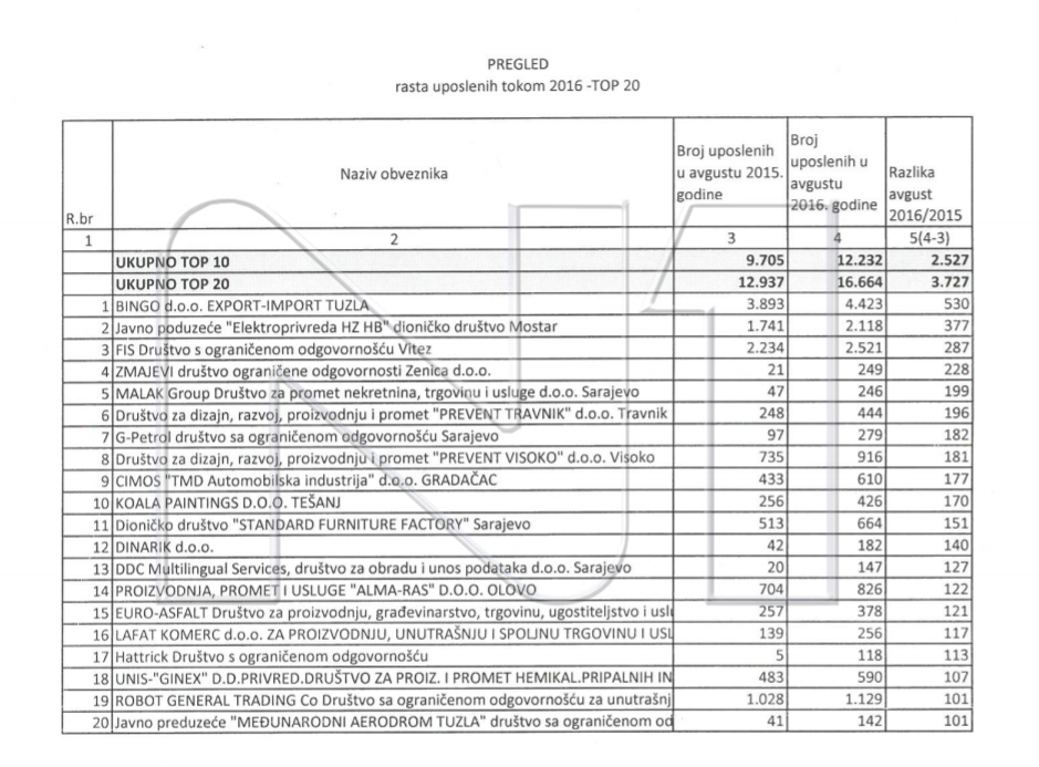 Novalić je sinoć u Pressingu, pak, prvi put javno otkrio zanimljive podatke kojima njegova Vlada raspolaže. Otkrio je i imena firmi koje su u FBiH tokom 2016. imale najveći rast broja zaposlenh.