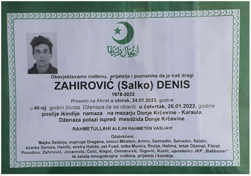 Sa žalošću javljamo rodbini, prijateljima, poznanicima, radnim kolegama i poslovnim partnerima, da je naš dragi kolega Denis Zahirović tragično preselio na Ahiret dana 24.01.2023. u svojoj 45-oj godini života.