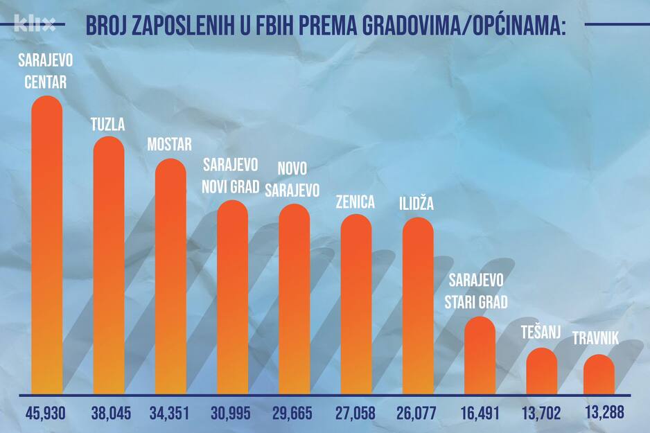Prema podacima koje smo dobili iz Porezne uprave FBiH, ove općine/gradovi u FBiH su najuspješniji prema broju zaposlenih: Sarajevo (123.081), Tuzla (38.045), Mostar (34.351), Zenica (27.058), Ilidža (26.077), Travnik (13.288), Tešanj (13.702), Živinice (11.110), Gračanica (10.976), te Visoko (10.367).