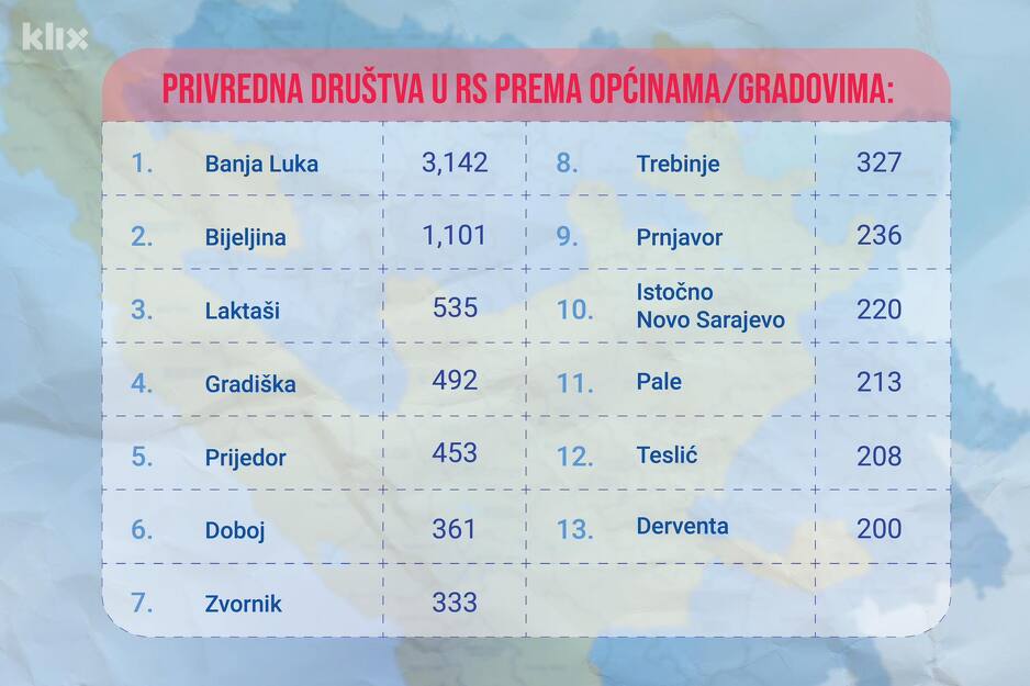 Prema broju privrednih društava u Republici Srpskoj po opštinama i gradovima prednjači Banja Luka sa 3.142 prijavljena privredna društva, slijedi Bijeljina s 1.101, zatim Laktaši 535, Gradiška 492, Prijedor 453, Doboj 361, Zvornik 333, Trebinje 327, Prnjavor 236, Istocno Novo Sarajevo 220.
