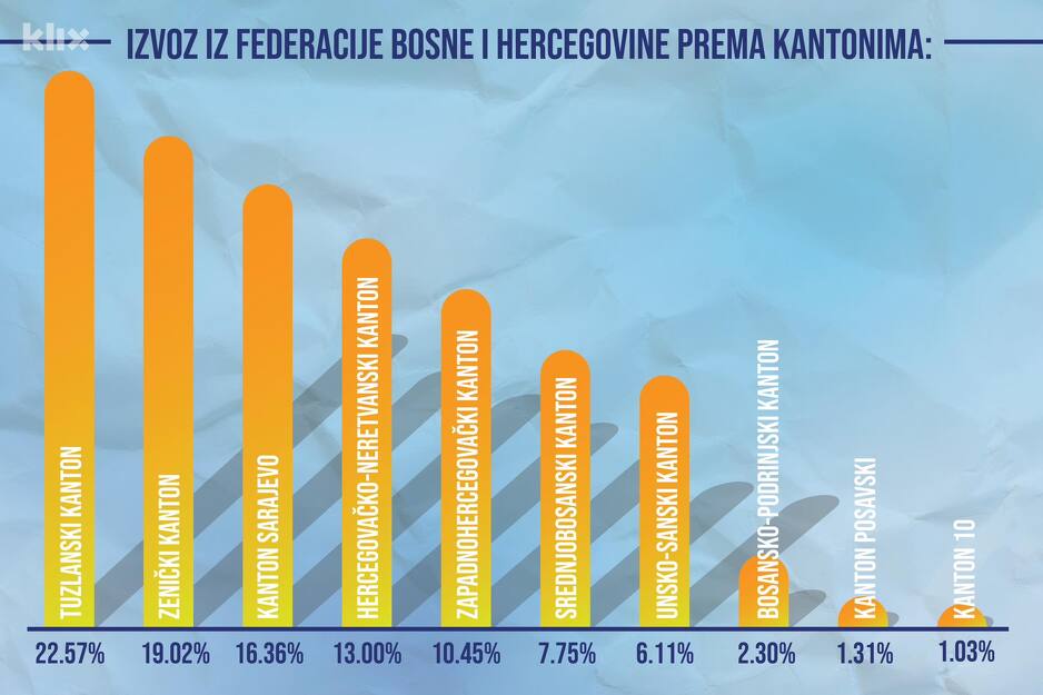 Što se tiče izvoza iz Federacije Bosne i Hercegovine, prema podacima Federalong zavoda za statistiku najveći izvoz ima Tuzlanski kanton (22.57%).