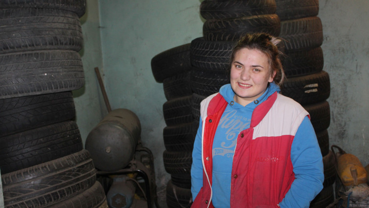 Djevojka rutinski barata dizalicama i gedorama, skida i montira gume
