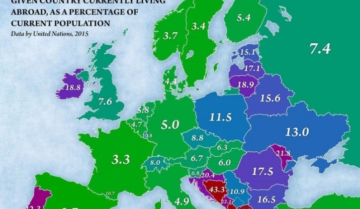 Na karti je prikazan procenat ljudi koji su rođeni u određenoj evropskoj zemlji a trenutno žive u inostranstvu, u odnosu…
