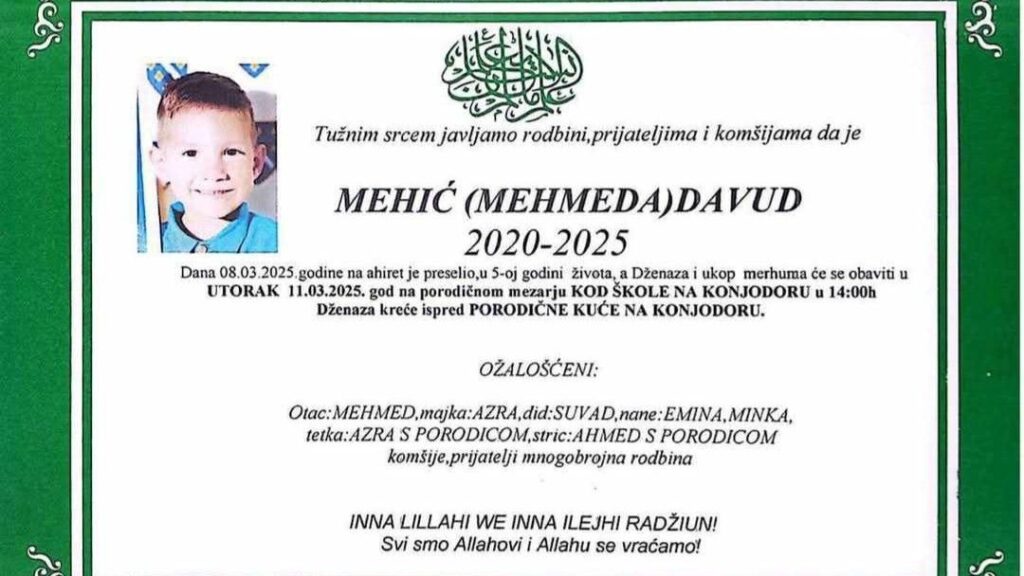 Danas je objavljeno mjesto i vrijeme obavljanja dženaze namaza dječaku Davudu. Dženaza i ukop će se obaviti u utorak 11.03.2025.…