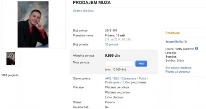 "Prodajem muža, 1981. godište, očuvan, lijep, zgodan, nema mane i oštećenja. Volim ga najviše na svijetu, ali ga prodajem zbog…