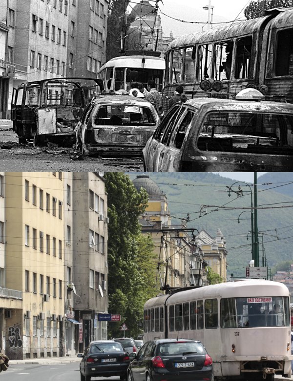 Zapaljeni tramvaj i pusta raskrsnica koja vodi ka KSC Skenderija, s jedne, i prema zgradi Predsjedništva Bosne i Hercegovine, s…