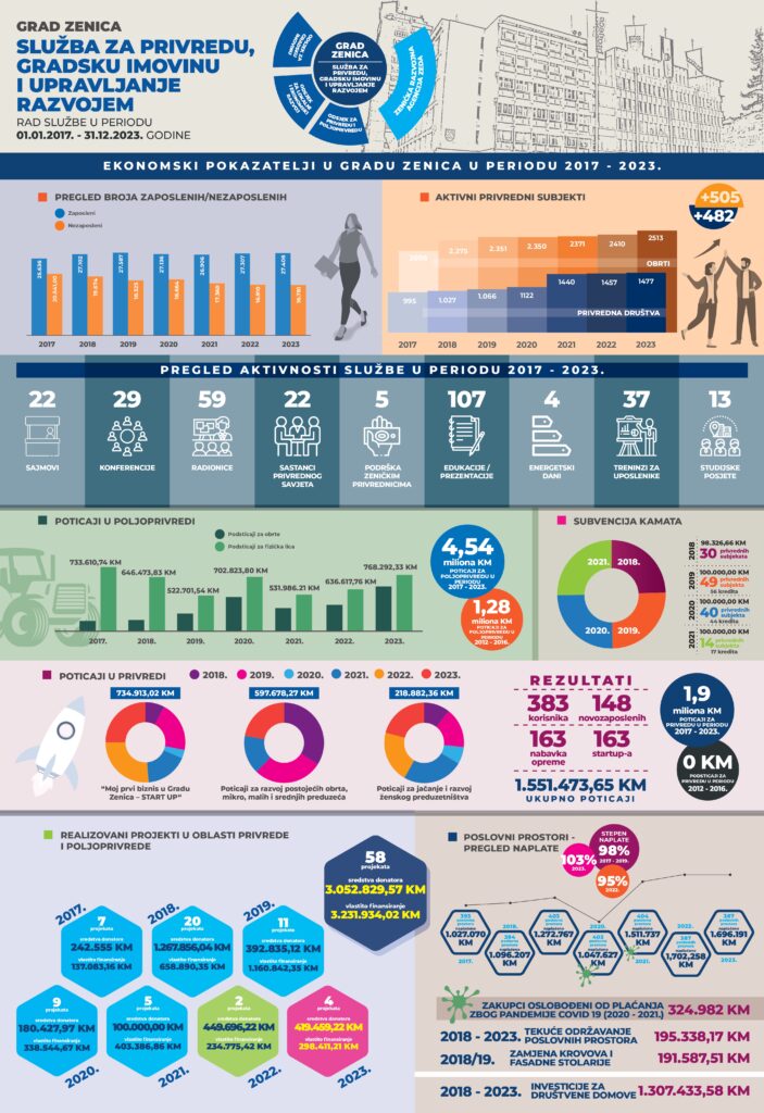 04.10.Grad Zenica kroz rad Službe za privredu, gradsku imovinu iupravljanje razvojem postigao je zavidne rezultate u razdobljuod 2017. do 2023. godine, čime je značajno unaprijedioprivredni razvoj i poboljšao ekonomske pokazatelje. Ulaganjem u brojne projekte, Zenica je osigurala podrškurazvoju privrede i poljoprivrede, dok su rezultati jasno vidljiviu povećanju broja zaposlenih, smanjenju nezaposlenosti irastu aktivnih privrednih subjekata. Ključni ekonomski pokazatelji U periodu od 2017. do 2023. godine, broj zaposlenih u Zenicikontinuirano je rastao, dok se broj nezaposlenih značajnosmanjio. Paralelno s tim, broj aktivnih privrednih subjekata je porastao za 987, dosegnuvši impresivnih 3.019 aktivnihsubjekata u 2023. godini. Ovi pokazatelji govore o stabilnomprivrednom rastu grada i stvaranju novih poslovnih prilika. Pregled aktivnosti službe Služba za privredu, gradsku imovinu i upravljanje razvojemrealizovala je širok spektar aktivnosti: • 22 sajma, • 29 konferencija, • 9 radionica, • 22 sastanka Privrednog saveza, • 5 programa podrške privrednicima,…
