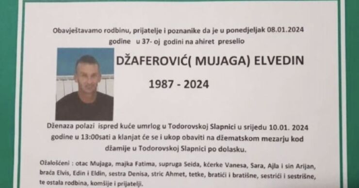 Obavještavamo rodbinu, prijatelje i poznanike da je u ponedjeljak 08.01.2024 godine u 37-oj godini na ahiret preselio DŽAFEROVIĆ( MUJAGA) ELVEDIN.…