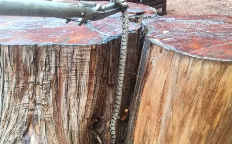 Poskoka koji se zavukao u deblo odrezanog stabla, vatrogasci iz Rovinja jučer su izvukli. Ovo stablo služi kao sto u…