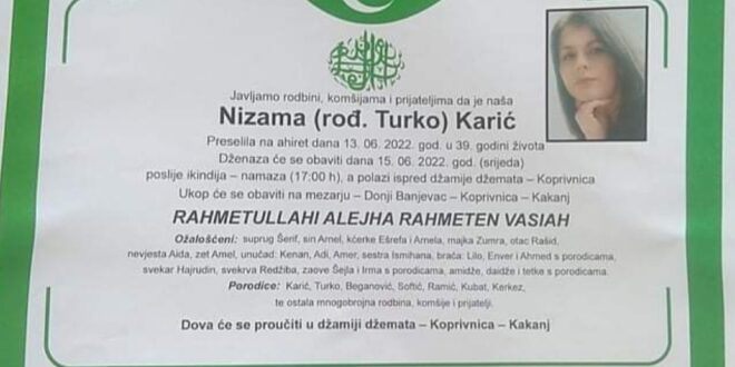 Na ahiret je jučer preselila Nizama Karić rođ. Turko u 39. godini života, porijeklom iz Fojnice. Dženaza namaz će se…