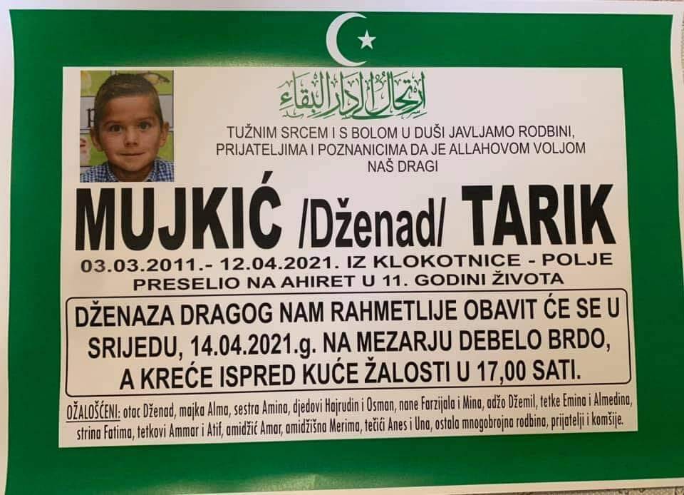 Tužnim srcem i s bolom javljamo da je preminuo Tarik Mujkić iz Klokotnice-Polje u 11. godini života.