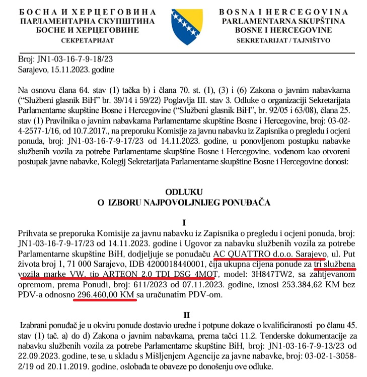 Parlamentarna skupština BiH je nakon određene trakavice kupila tri skupocjene limuzine čija konačna cijena s uračunatim PDV-om iznosi 296.460 KM. Prema odluci Kolegija Sekretarijata PSBiH za najpovoljnijeg ponuđača za nabavku službenih vozila izabrana je firma AC Quattro iz Sarajeva.