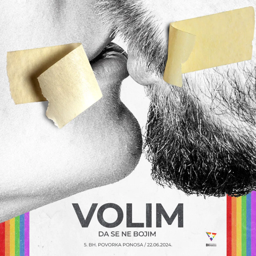 “Vizual predstavlja osnovni iskaz ljubavi: poljubac, kojeg otkriva pocijepana traka. Ljubav je jedna od osnovnih ljudskih emocija, a ljudska je potreba iskazati je. Zar i u 2024. iz straha moramo sakrivati poljupce?” – pitaju se dizajnerica Una Mazrak i dizajner Ismar Žalica, autori vizuelnog identitetea 5. Bh. povorke ponosa.