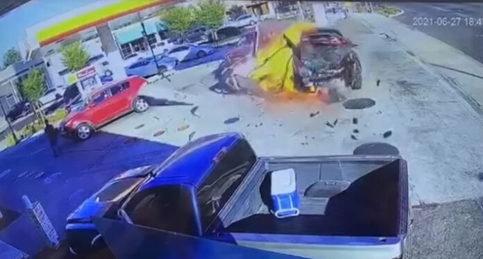 Nesreća se dogodila u kalifornijskom gradu Ceresu kad je 23-godišnja vozačica proletjela svojim Nissanom kroz benzinsku stanicu i pomela jednu od crpki. Udarac je bio toliko jak da je nadzemni dio pumpe odvaljen u cijelosti, a Nissan je odletio u zrak.