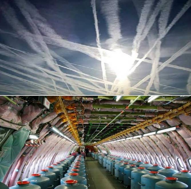Drugo, fotografije gde možete da vidite buriće u unutrašnjosti putničkih ili transportnih aviona predstavljaju raspored i simulaciju tereta kod vazduhoplova kojisu u razvoju i završnoj fazi testiranja. To je standardna metodologija ispitivanja da li se avion normalno ponaša u vazduhu u simuliranim uslovima gde burići predstavljaju težinu koju imaju putnici. Bez ovog načina ispitivanja putniki avioni sigurno ne bi bili bezbedni za letenje. Onda se te fotografije povežu sa fotografijama mlaznica sa aviona koji zaprašuju komarce ili useve i eto dokaza. Kakvih? Da avioni za prskanje komaraca truju iz vazduha? Pa to svi znamo Da oni to i rade.