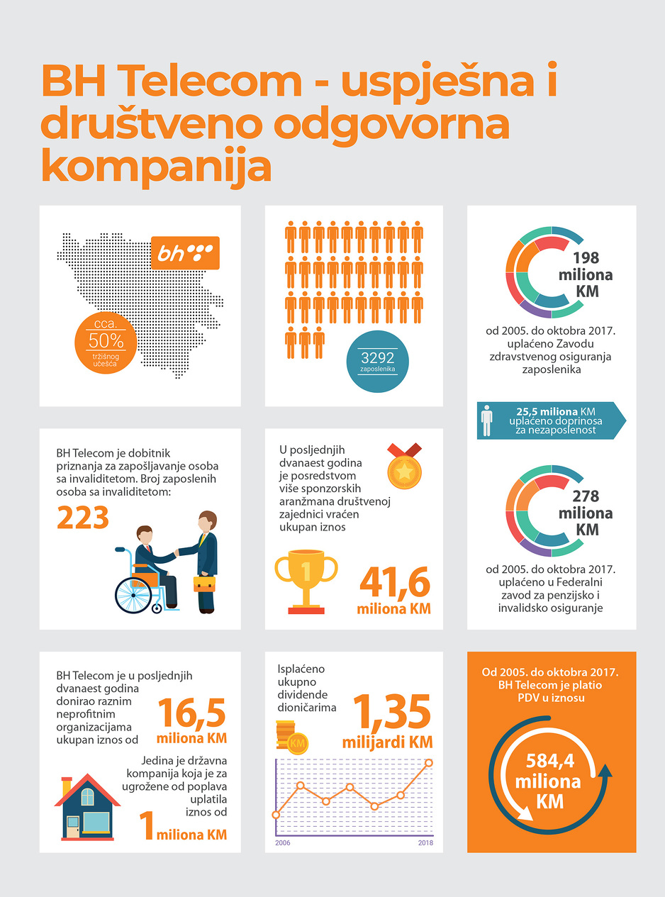 “Posredstvom više sponzorskih aranžmana u posljednjih dvanaest godina je društvenoj zajednici vraćen ukupan iznos od 41,6 miliona KM, od čega je 14,6 miliona KM usmjereno za ostvarenje uspjeha društveno značajnih partnera kao što su Nogometni savez BiH, Košarkaški savez BiH, Rukometna reprezentacija BiH, Reprezentacija sjedeće odbojke i slično. Kompanija kontinuirano podržava sve značajne kulturne događaje i institucije kao što su Zemaljski muzej, Nacionalna biblioteka, Festival Mess i brojni drugi. Također, značajano ulaže u brojne humanitarne projekte na području države, vodeći računa o socijalno ugroženim kategorijama društva. Ako govorimo o donacijama, BH Telecom godišnje dodjeljuje veoma transparentno milion KM donacija i od 2005. godine do danas je za ovu svrhu usmjereno 16,5 miliona KM. Ono što je značajno istaći jeste da smo posljednje tri godine radili tematske javne pozive za oblast obrazovanja, zdravstva i javnih kuhinja”, zaključio je Zaimović.