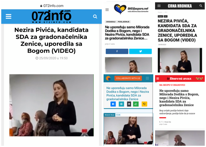 Brojni bosanskohercegovački mediji bruje o nezapamćenoj, sramotnoj, izjavi Emine Selimović, kandidatkinje SDA za Gradsko vijeće Zenice, a prilkom obraćanja na nedavno održanom političkom skupu u Orahovici kod Zenice kada je nespretna Zeničanka Nezira Pivića, kandidata zeničke SDA za gradonačelnika Zenice, uporedila sa Bogom.