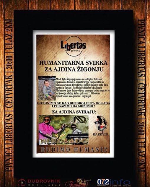 Tim povodom u organizaciji dobrih ljudi grada Zenice u popularnoj Pivnici Libertas organizuje se humanitarna svirka za oboljelog Zeničanina Ajdina Žigonju. Svirka je planirana za četvrtak, 17. 09. 2015. godine sa početkom u 20:00 sati, a ulaz iznosi svega 2,00 KM.