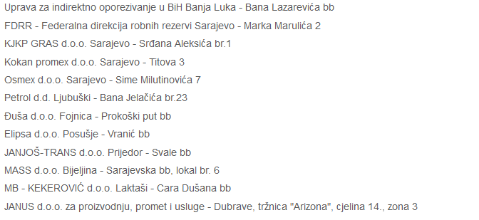 Na posljednjem mjestu od 2702 firme nalazi se Kokan Promex d.o.o. iz Sarajeva sa dugom od 25,010.46 KM.