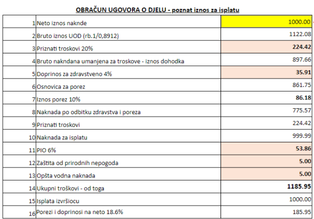 A obračun ugovora o djelu u Federaciji BiH za neto iznos od 1.000 KM izgleda ovako: