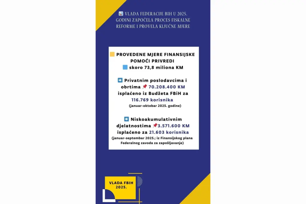 Za prvih devet mjeseci 2025. godine privatnim poslodavcima i obrtima iz Budžeta FBiH izdvojeno je 70.208.400 KM za ukupno 116.769 korisnika, dok je zaključno sa septembrom osigurano dodatnih 3.174.900 KM za 21.603 korisnika iz niskoakumulativnih djelatnosti, saopćeno je iz Federalne vlade.