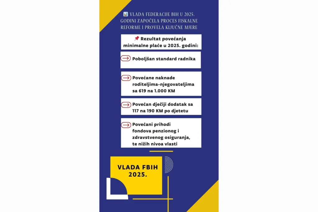 Od 1. januara 2025. godine minimalna plaća u Federaciji BiH povećana je sa 619 KM na 1.000 KM, čime je ostvaren značajan iskorak u poboljšanju standarda radnika.