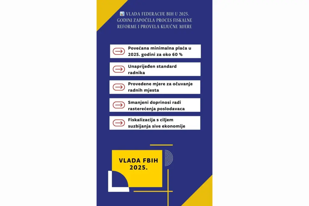 Vlada Federacije Bosne i Hercegovine u 2025. godini nastavila je provoditi sveobuhvatne mjere na jačanju ekonomskog i socijalnog položaja građana, unapređenju standarda radnika, očuvanju radnih mjesta, rasterećenju poslodavaca i suzbijanju sive ekonomije.