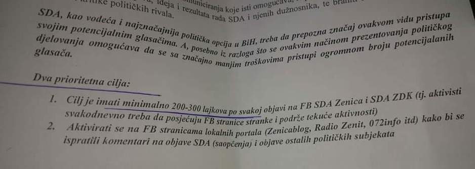 U jednoj od instrukcija koja se odnosi na društvene mreže navedeno je kako je cilj imati “minimalno 200-300 lajkova po svakoj objavi na facebooku SDA Zenica i SDA ZDK”.