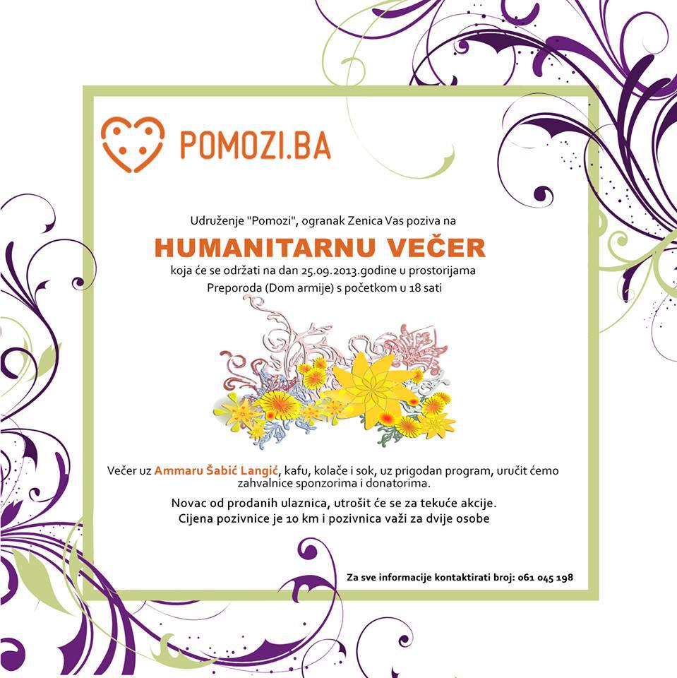 Ogranak Pomozi.ba – Zenica u srijedu, 25. 09. 2013. godine s početkom od 18:00 sati, u prostorijama BKZ Preporod, održat će humanitarno veče uz zanimljiv kulturno-zabavni program.