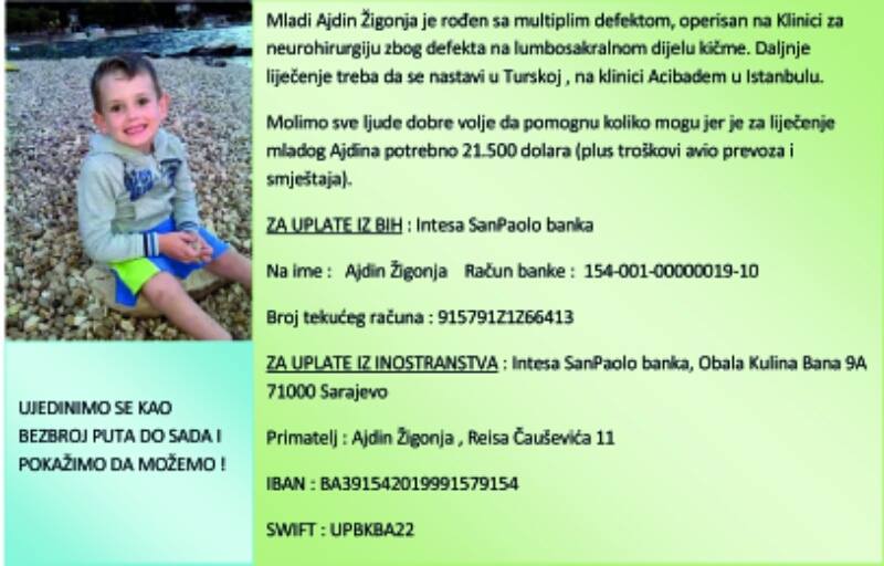 Riječ je o malom dječaku Ajdinu Žigonji, koji ima dijagnozu SPINA BIFIDA OCCULTA (rascijep kičmene moždine). Operacija je potrebna da bi se zaustavio dalji rascijep i da ne bi došlo do toga da dječak ostane nepokretan, a njegovim roditeljima je potrebna finansijska pomoć.