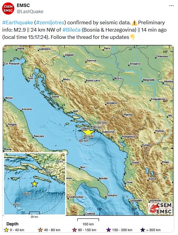 Zabilježen je u 15 sati i 17 minuta. Epicentar je zabilježen na 24 kilometra sjeverozapadno od ovog bosanskohercegovačkog grada, javlja EMSC.