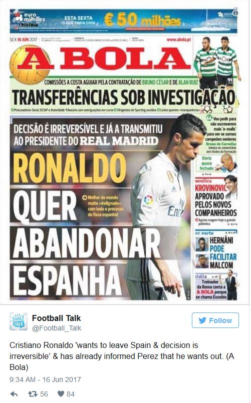 Ugledni list A Bola je na naslovnici objavio priču koja se munjevito proširila svijetom a kako se navodi; Ronaldo je već obavijestio upravu Reala da želi napustiti Real ovog ljeta.