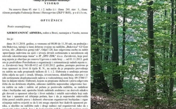 Tužilaštvo Zeničko-dobojskog kantona podiglo je optužnicu protiv Ahmeda Sjerotanovića iz Vareša jer je 16. oktobra 2018. godine, u vremenu od 8 do 11.30 sati, na području općine Vareš u mjestu Bukovica, tačnije u šumi državne svojine na radilištu „Bukovica“ GJ Gornja Trstionica – Bukovica, sliv „Bukovica gornji tok“, kao odgovorna osoba za zaštitu na radu, postupio protivno propisima i time izazvao opasnost za život ili tijelo R. N.