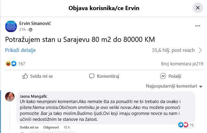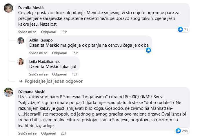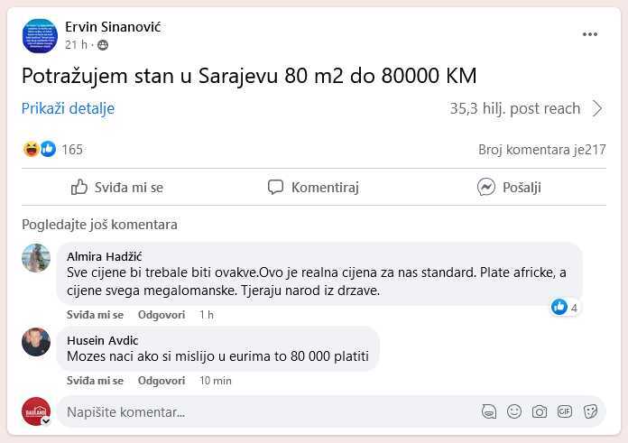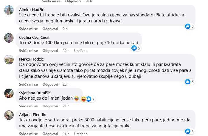Drugi član grupe našalio se s rješenjem: “Možeš pronaći 80m2 za 80.000 KM! Samo trebaš pronaći neki lukobran u luci Sarajevo!” Dok su neki komentari bili šaljivi, mnogi su izrazili frustraciju zbog trenutne situacije na tržištu nekretnina u Sarajevu. “