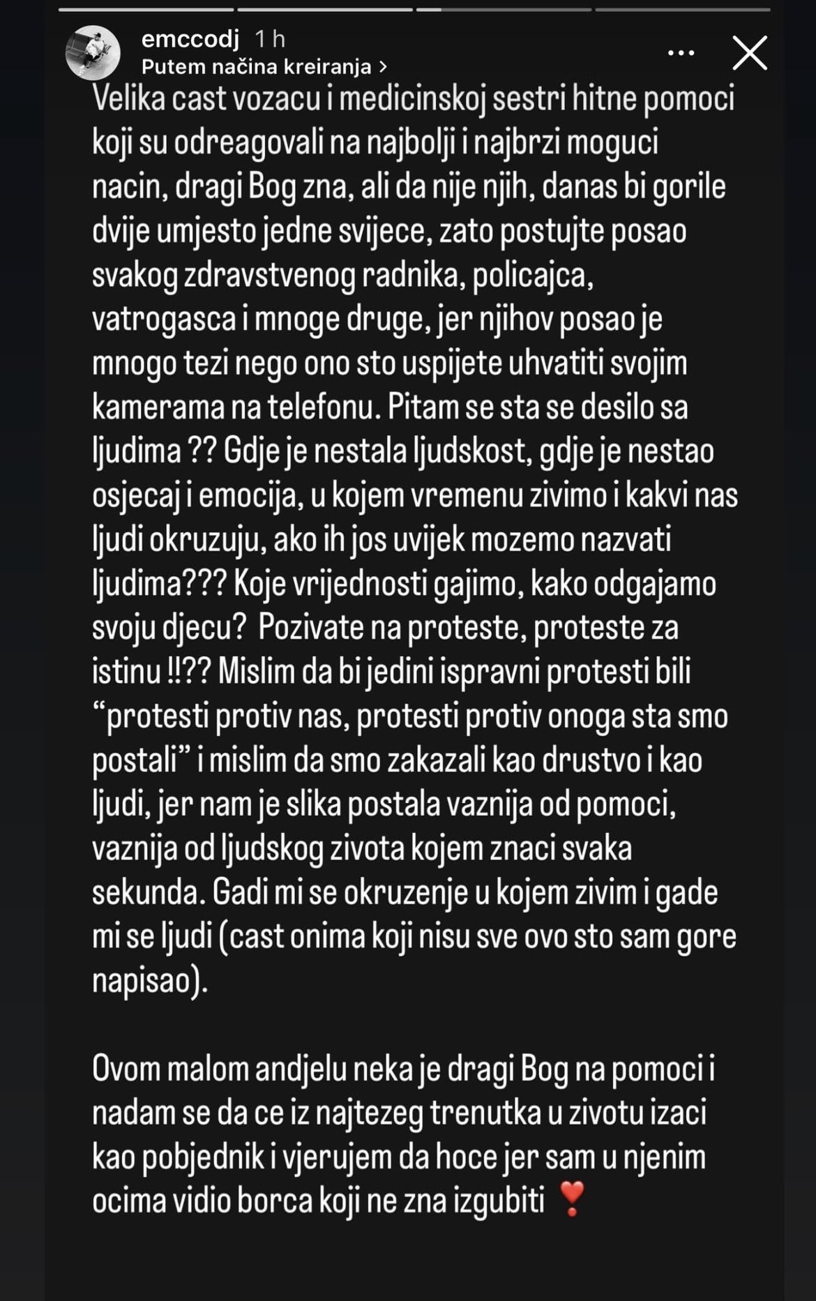 Posebnu zahvalnost i poštovanje uputio je vozaču i medicinskoj sestri Hitne pomoći, naglašavajući da su reagovali brzo i profesionalno, te da je njihova pravovremena intervencija bila presudna. Poručio je i da javnost treba pokazati više poštovanja prema zdravstvenim radnicima, policajcima, vatrogascima i svima koji svakodnevno rizikuju svoje živote.