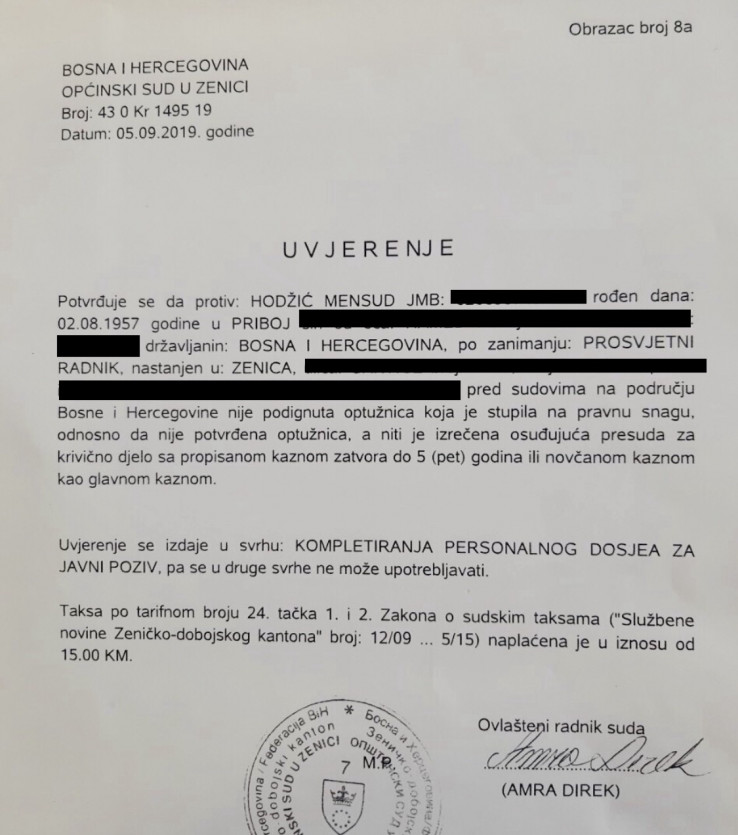 Interesantno, iako je optužnica protiv Hodžića potvrđena danas, a ranije podignuta, on je uspio danas dobiti uvjerenje s Općinskog suda u Zenici da protiv njega, pred sudovima na području BiH, nije podignuta optužnica, a niti je izrečena osuđujuća presuda za krivično djelo s propisanom kaznom zatvora do pet godina ili novčanom kao glavnom kaznom.