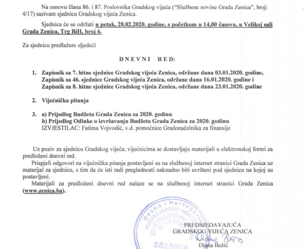 Kako je portal 072info sinoć i objavio, u petak će biti održana sjednica Gradskog vijeća (GV) Zenica, na kojoj će biti usvojen budžet i odblokiran grad.