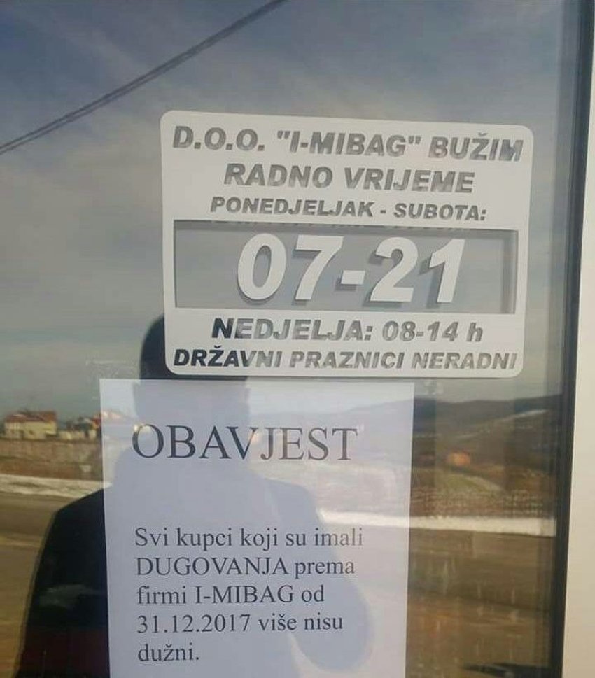 Na vratima poslovnih prostorija na adresi Konjodor bb u Bužimu istaknuto je obavještenje u kojem piše: “Svi kupci koji su imali dugovanja prema firmi I-Mibag od 31. decembra 2017. godine više nisu dužni”.
