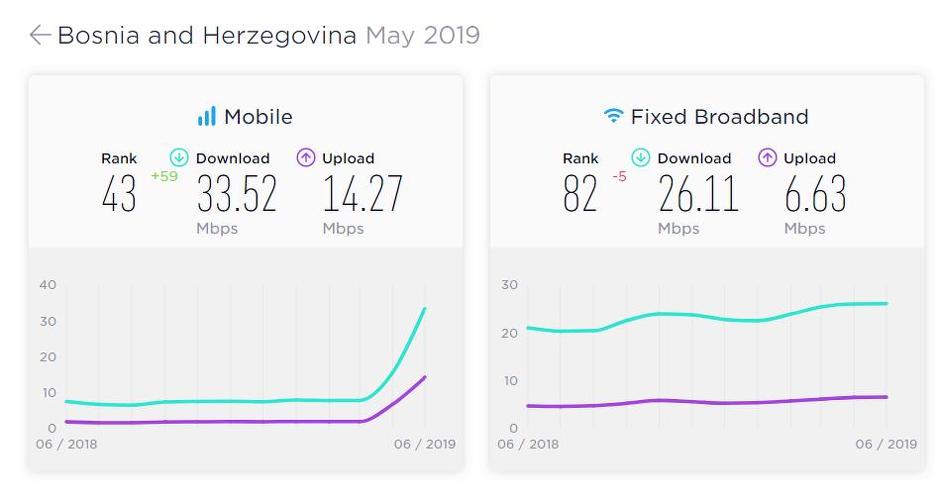 internetu, govore kako je Bosna i Hercegovina u maju 2019. godine bila rangirana na 43. mjestu po prosječoj brzini mobilnog interneta.