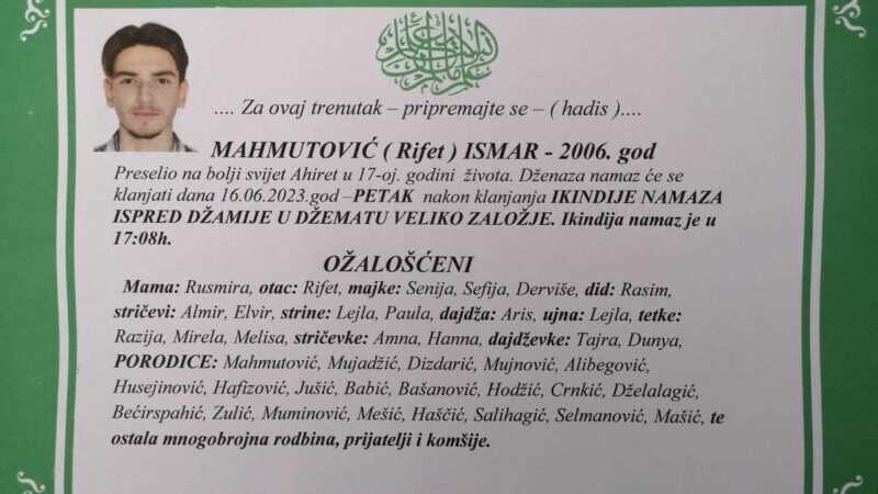Dženaza mladiću Ismaru Mahmutoviću (2006. godište) bit će klanjana u petak nakon ikindije namaza ispred džamije u džematu Veliko Založje.